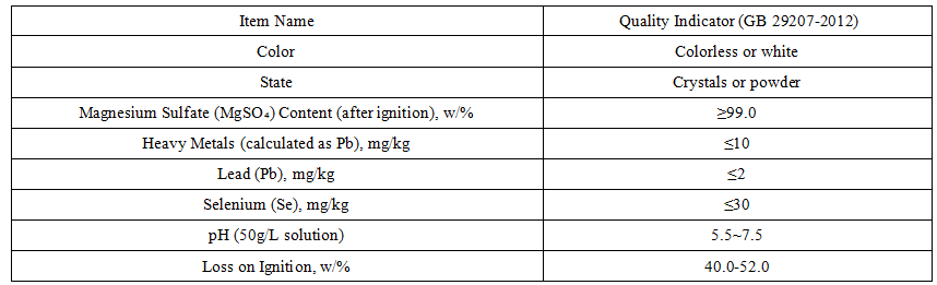 It appears as colorless crystals or white powder, with a MgSO₄ content (after ignition) of ≥99.0%, pH 5.5~7.5, and loss on ignition of 40.0~52.0%. It has good chemical stability, low impurity content, and is easily dissolved in water, suitable for various processing technologies.
